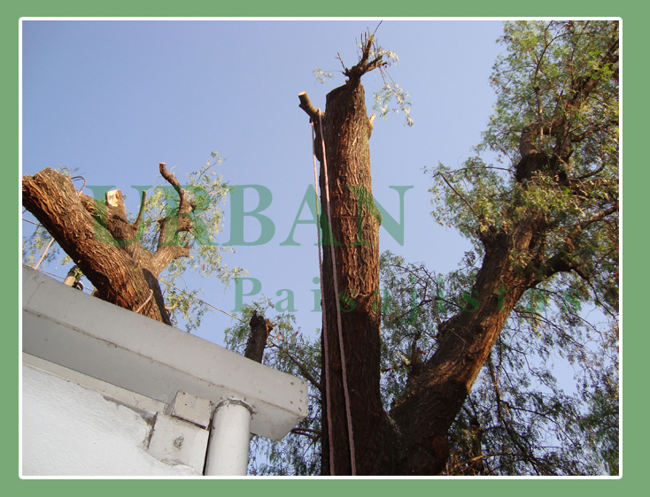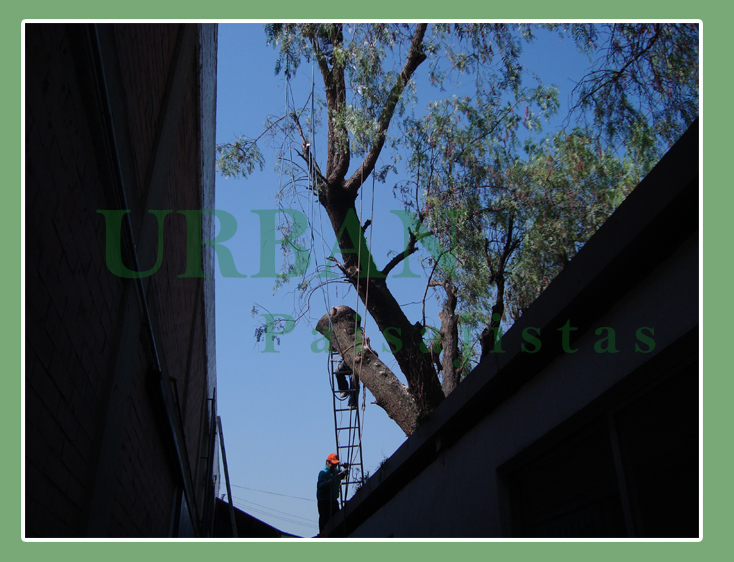 Derribo de un pirul (Schinus molle) de 12 m de alto y 14 m de fronda, ramificado en tres troncos principales.