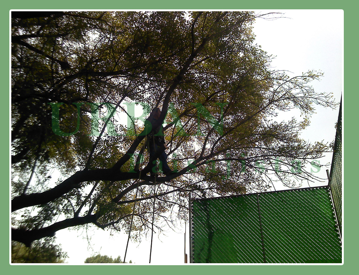 Poda de aclareo de un fresno (Fraxinus uhdei) de 13 m de alto y 16 m de fronda.